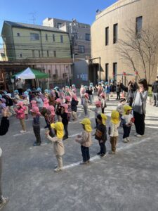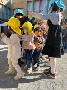 毎週水曜日は全園児が揃って楽しい音楽に合わせて体操をします。寒くても身体をたくさん動かして元気な子ども達です。体操の最後は年長組さんがトンネル作り、中をくぐってお部屋に戻りました。
