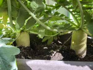 3学期は寒い日が多くなりますね。寒さの中でも命は成長しています。チューリップの芽が出てきています!何色が咲くのか楽しみですね。大根はもう収穫出来そうです。