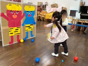 鬼に向かって元気よく『おにはーそとー。ふくはーうちー』とボールの豆をぶつけました♪