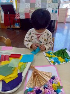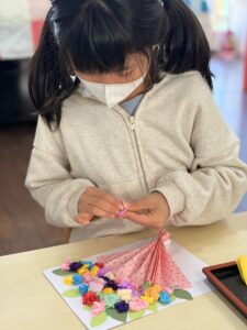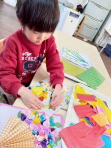 聖句ボード~預かり保育~ 今日のひとこま 預かり保育 2026.02.24 預かり保育の子どもたちが、毎月の聖句ボードの装飾を製作しています。 今回は、3月の聖句ボードをみんなで作りました。 春らしく花束です!薄い紙を破れないように取って優しくつけていきます。 とても集中していました。可愛く仕上がった作品をみて「もう一枚作りたい‼」と自分用に製作をしていました★ 幼稚園の前を通った際には、ぜひご覧になってくださいね。