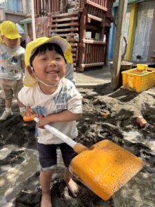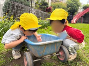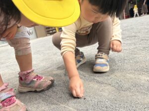 園庭では、泥遊びを思い切り楽しむ姿や、てんとう虫やダンゴムシに触れて喜ぶ姿が見られました。
