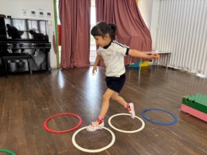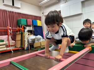 並んだまま前につめることも意識しながら平均台を渡ってみたり、巧技台で作ったはしごを渡ってみたり、全身の力を使いました。