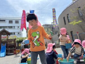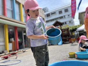 こいのぼり製作で余った絵の具に水を入れて色水にして遊びました。