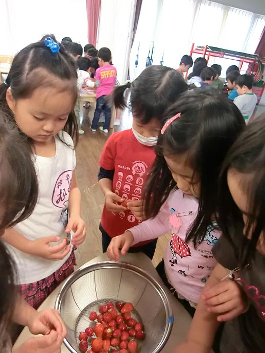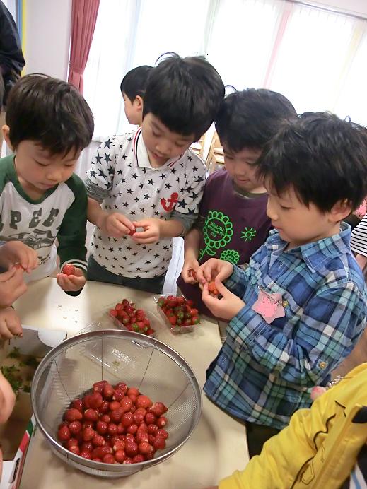 いちごジャムを作りました(4月30日) お知らせ イベント 今日のひとこま 2013.04.30 さくらさんとたんぽぽさんが、いちごジャムを作りました。みんなでやおやさんに行って、いちごを買いました。 幼稚園に帰って、いちごを洗いへたをとって煮込みました。幼稚園がいちごジャムの良い香りでいっぱいになりました。