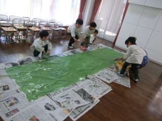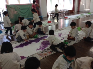 年長組になって、初めての共同作業。  自分の身体の何倍も大きい和紙を染めていくのは、大変です。