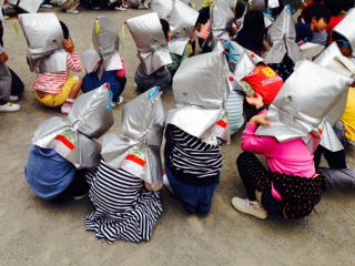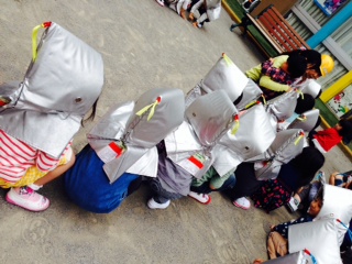 小さなゆり組さんにとっては、初めての防災頭巾を被っての避難訓練!! ちょっぴり涙が出たけれど、先生のお話しをよく聞いて逃げられていましたね。