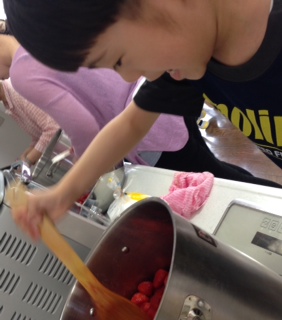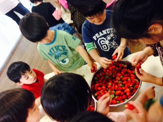 めぐみ幼稚園では、毎年『いちご』の美味しいこの時期に、年中組と年長組とで『いちごジャム』を作っています。