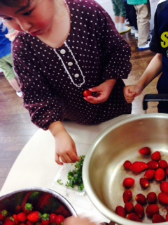 幼稚園に戻ると、いちごを洗ってヘタ取りをしました。