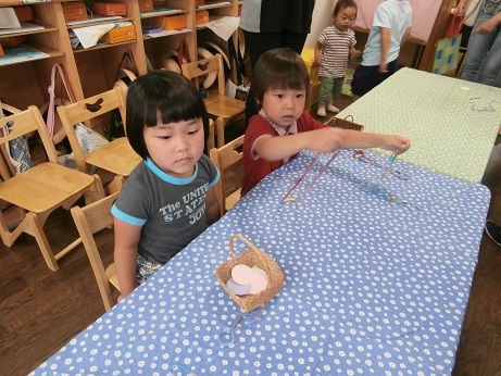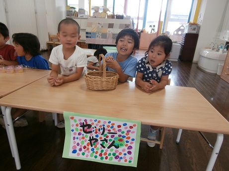 2階のホールでさくらぐみさんのカエルをかいました。ゼリーを食べて、遊びました。