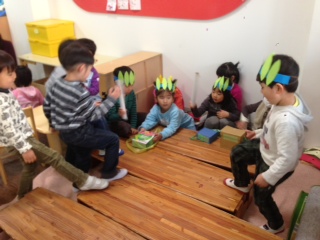 頭に葉っぱのかんむりをつけて、みんなで集まってたいこをたたいて足を踏み鳴らして…何かのお祭り!!?