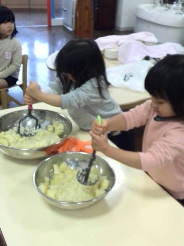 ゆり組はポテトマッシャーを使って初めてサラダを作りました。きゅうり、ニンジン、ハムにマヨネーズを加え「おいしくなあれ、おいしくなあれ」と言いながら仕上げていきました。