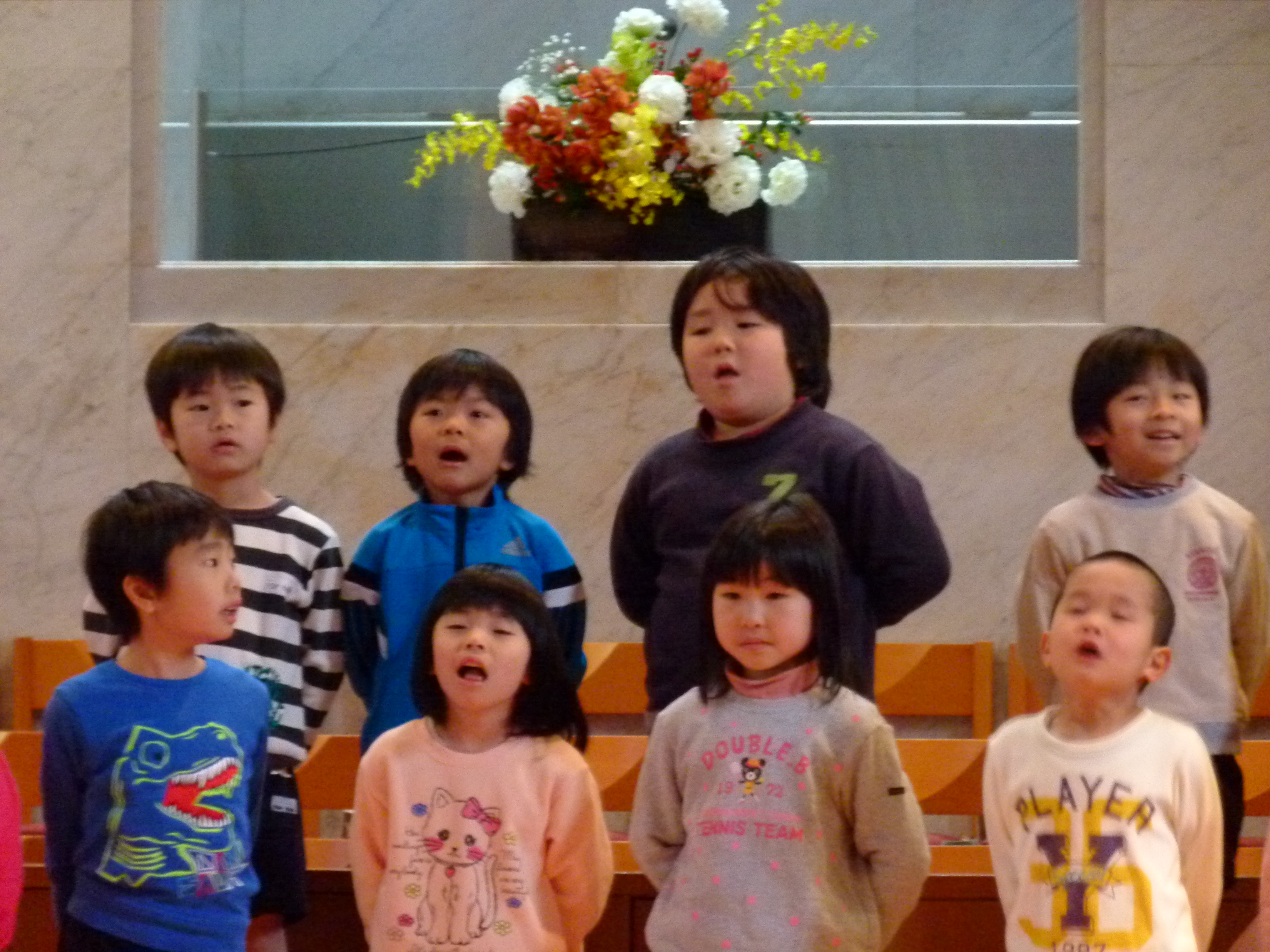 2番・3番まであるような長い曲の歌詞もしっかり覚えています。進級した頃に歌った歌や運動会・ページェントの余韻も楽しみつつ…友だちと一緒にいる嬉しさや生きている喜び、守られている事の感謝の曲を歌って…♪さよならぼくたちのようちえんで、締め括ります。