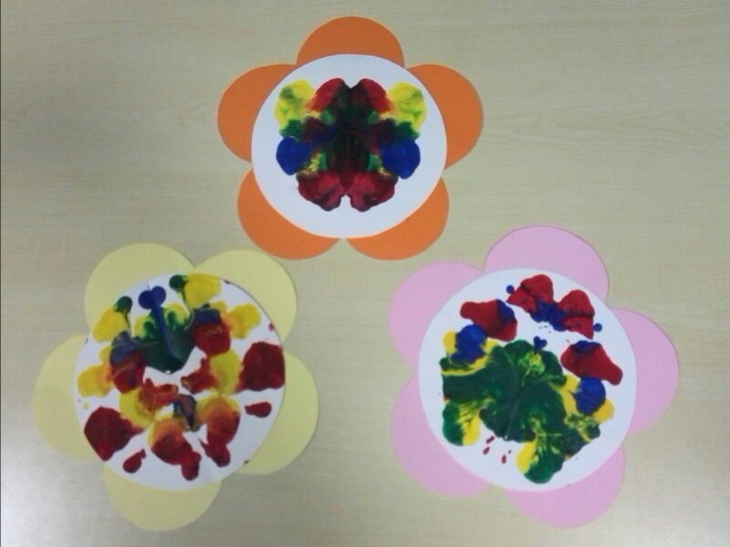 絵具を垂らした画用紙を半分に折り、「きれいなお花になりますように」と開けると・・・綺麗な模様ができていました。