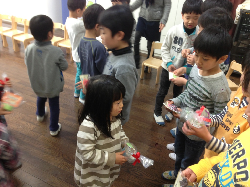 まずはおやつを食べて、さくらさんから歌のプレゼント。ゆりさん、たんぽぽさんからさくらさんに、さくらさんからはゆりさん、たんぽぽさんに心を込めて作ったプレゼントを渡しました。
