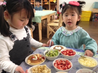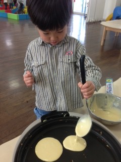 パンケーキを焼いて、ご家庭から少しずつ持ってきて頂いたフルーツをたっぷりのせて♪