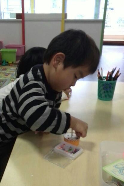 「やったぁー」と大喜び! カップの色を選び、ビーズも好きな色、形を選んで飾りました。カードも作ってお家に持って帰りました。