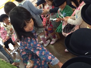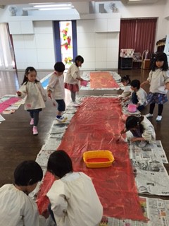 めぐみ幼稚園恒例、年長組の大きな大きなこいのぼり作りが昨日から始まりました。