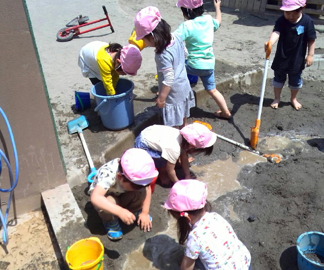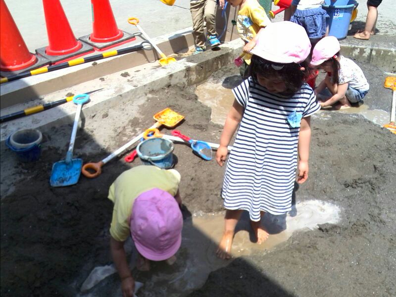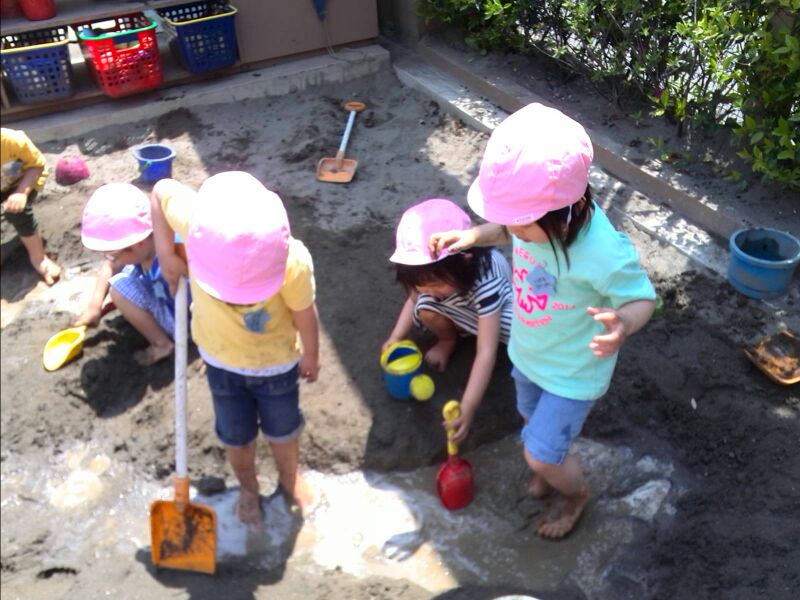 夏のように暑い一日。ゆりさんは初めて泥んこ遊びをしました。砂場に出来た川に手や足を入れて「気持ちいい!」泥と水の感触を楽しみました。