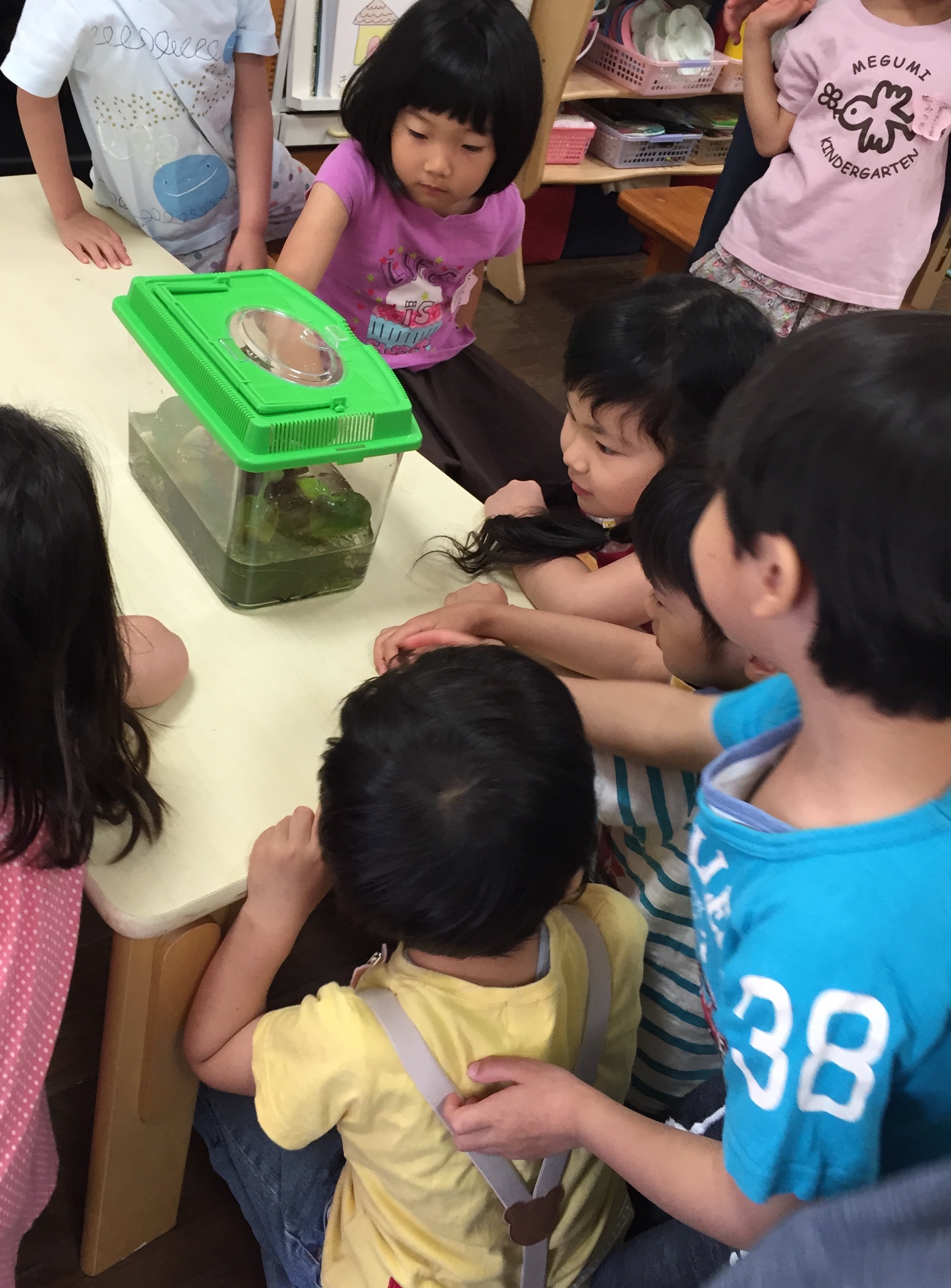 『♪あしがでて、てがでて、おがとれた~』と、歌の通りに、可愛い足が生え、手が出て、カエルらしい姿にになっていくのに、子どもたちは毎日釘付けでした。
