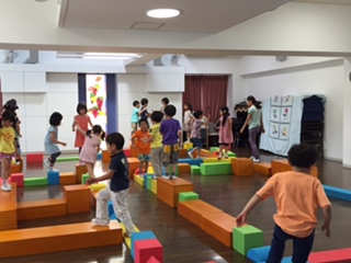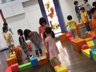 今日さくら組は、ホールで大型積み木やソフトブロックも存分に使って、アスレチックのコースを作って遊びました。