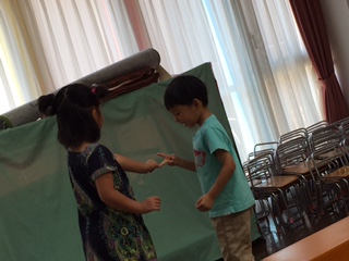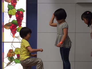 お片づけも一つ一つ丁寧に片付け、最後に一つ…問題『三角と三角の積み木を合わせて四角にしてください』1人ひとり挑戦してみたら…全員大正解で、元気に体操をしに園庭に行きました。